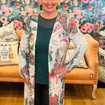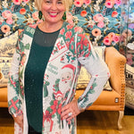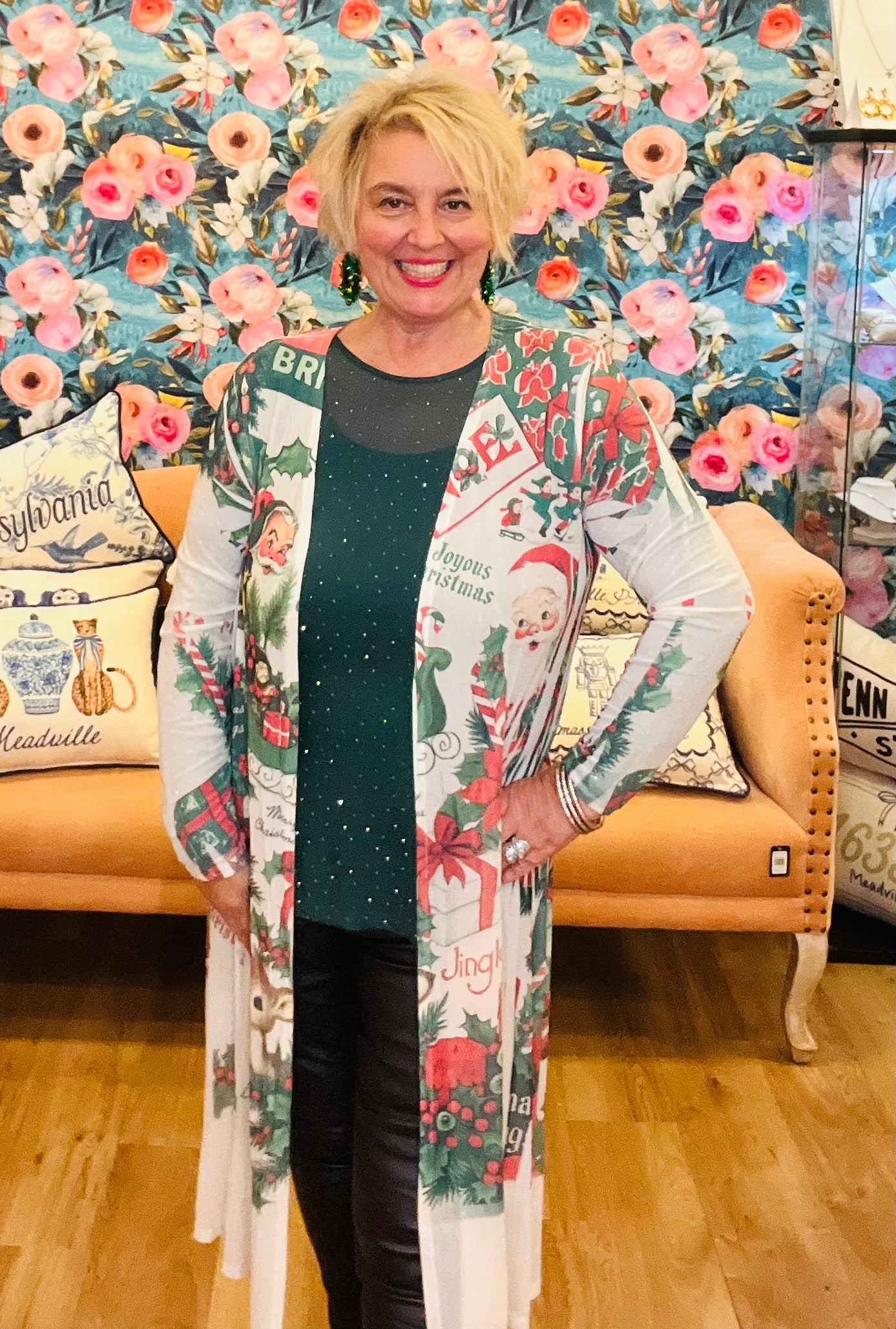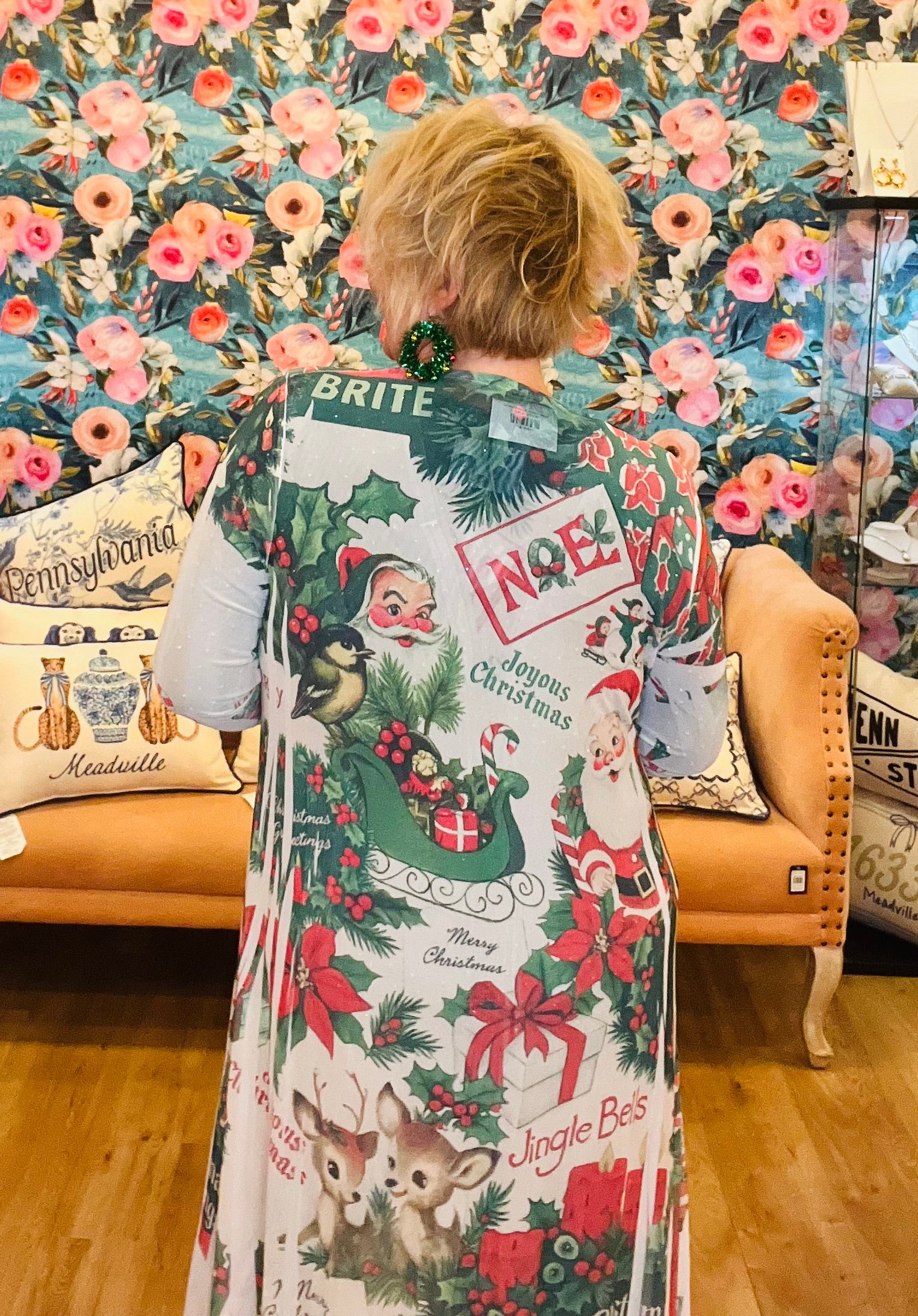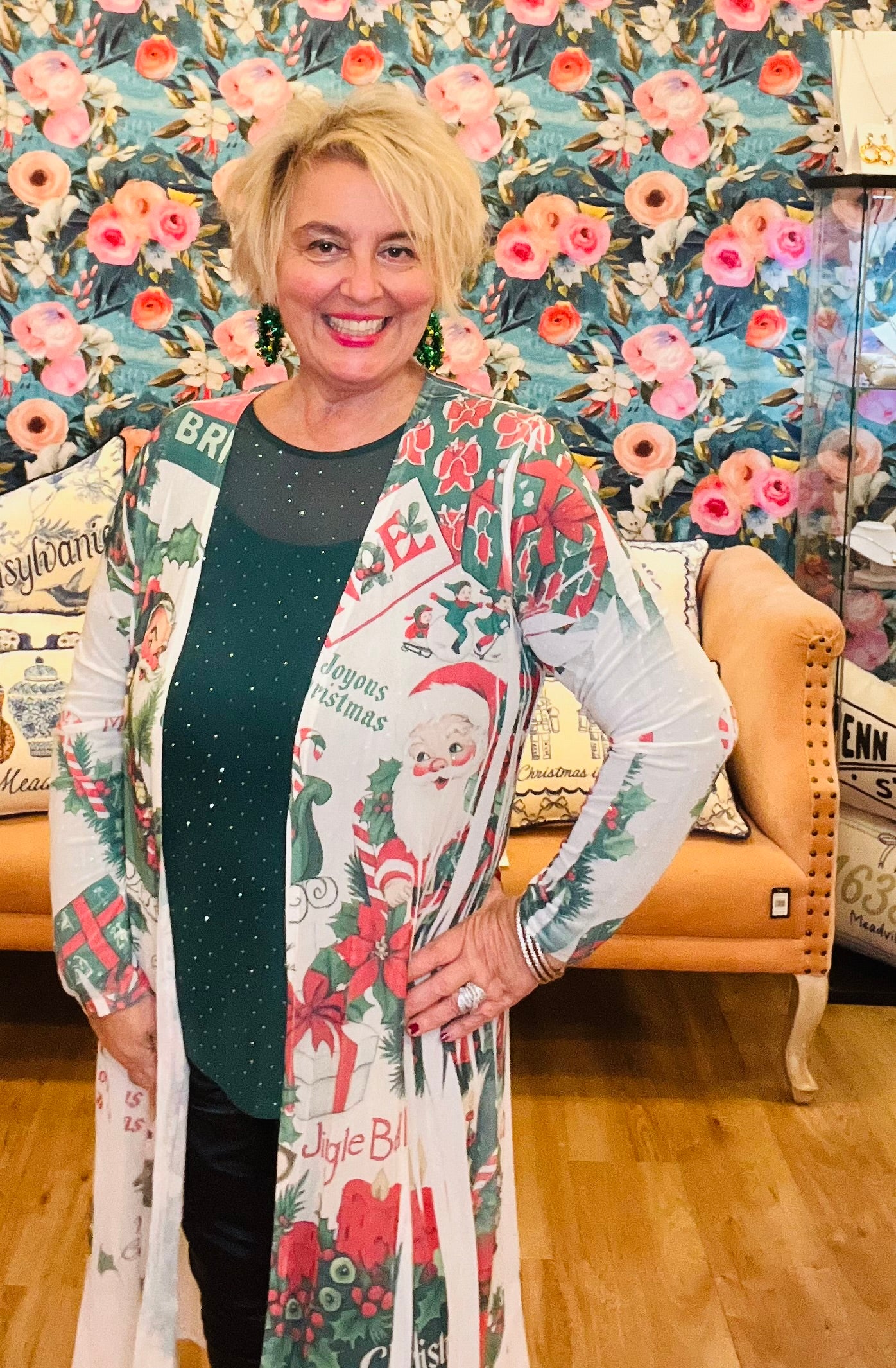 Are you a lover of all things vintage holiday? Then you MUST add this duster to your wardrobe! It's a thin mesh, knee length duster that features a vintage looking Christmas pattern. Wear it over our Emerald City mesh top or matching Vintage Holiday mesh top!