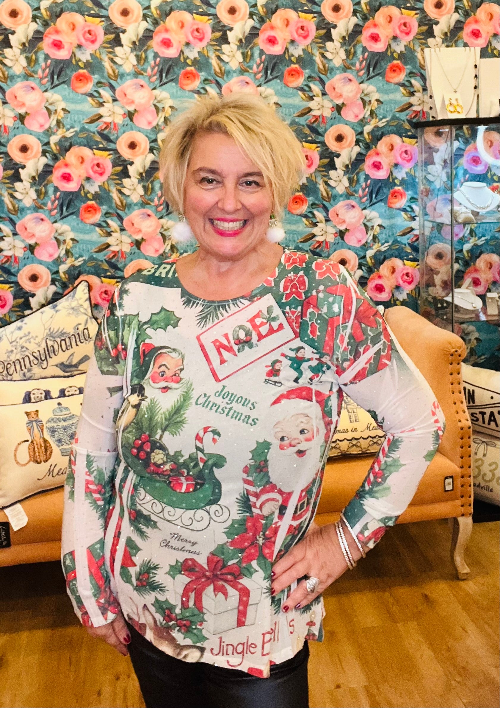Are you a lover of all things vintage? Then this holiday top is for you! This mesh top is lightweight & features a vintage Christmas pattern covered in rhinestones. Pair it with our Vintage Holiday Rhinestone Duster for an extra festive look!