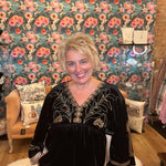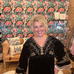 Embroidered details are too hard to resist on clothing! This rich dark green velvet top by Jodifl features a tie neck & has colorful flowers embroidered around the neck line. It would look great paired with cream colored pants & brown booties going into the fall season