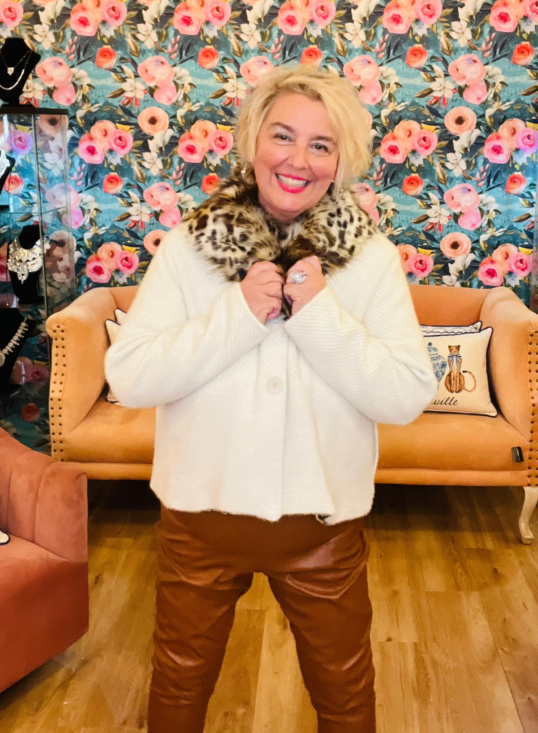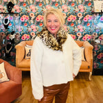 Our Italian one size brand did it again!  Feeling so special in the leopard faux fur collard sweater!